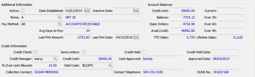 The Fitrix customer master screen shows you the information you need to see about their credit status all in one place. It shows you their payment terms, credit limit, aged balance due amounts and total open orders, available credit, average days to pay, % over limit allowed and who to contact if there are issues with collections.